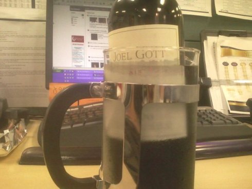 Today after work my co-workers and I opened a long-saved bottle of Joel Gott “815” cabernet sauvignon. (Named after the birth date of Gott’s daughter.) Four of us chipped in a few bucks each for the bottle back in MARCH, but there never was any real occasion or opportunity to open it up and enjoy. What better day than the day before the Fourth of July?