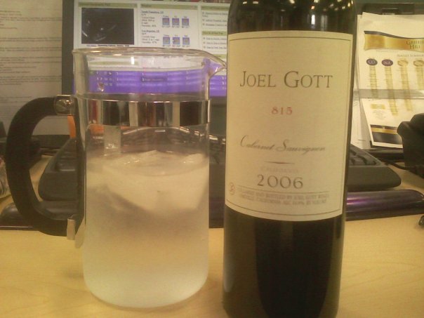 Today after work my co-workers and I opened a long-saved bottle of Joel Gott “815” cabernet sauvignon. (Named after the birth date of Gott’s daughter.) Four of us chipped in a few bucks each for the bottle back in MARCH, but there never was any real occasion or opportunity to open it up and enjoy. What better day than the day before the Fourth of July?