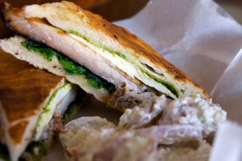 The coffee and espresso are unimpeachable, so I want to turn next to what I think really sets Northside Social apart: its food.  Sure, Big Bear serves sandwiches, and SoHo serves sandwiches, but Northside Social serves sandwiches.  Really delicious ones, in fact.  I fell in love with their crisp pork belly sandwich which comes between slices of an Italian feather loaf with brocolli rabe, pesto, and smoked mozzarella.  FREAKING DELICIOUS: