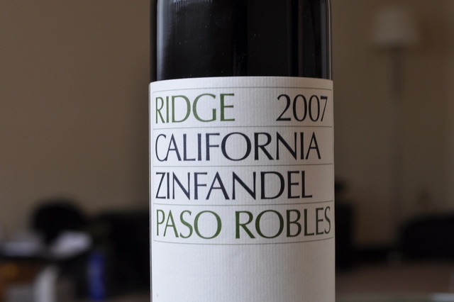 The 2007 Ridge “Paso Robles” Zinfandel. 100% Zinfandel. I had had a bottle of the ’06 Paso Robles and loved it. We opened it and drank it as the night slipped away and the morning, with its prospect of her leaving, edged ever closer. The Ridge was a light color, with very pronounced acidity but good firm tannins. It was zippy, with cranberry and bright red fruits underlined by darker notes of prune. A hint of menthol and pepper.
