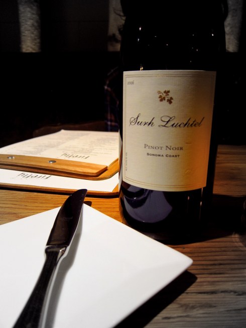 Throughout the meal we shared a bottle of the 2006 Surh Luchtel Sonoma Coast Pinot Noir. I had purchased a bottle of this online, through InVino. It was a nice example of California Pinot, not too concentrated, big, or fruity. It was still fruitier than I would have liked, but it also had some nice duskiness and maybe a trace of graphite. It had a short to medium finish and a medium body. All in all, good but not great. Nonetheless, it was a good food wine and enjoyable with both our dishes. The $15 corkage fee wasn’t bad, either.