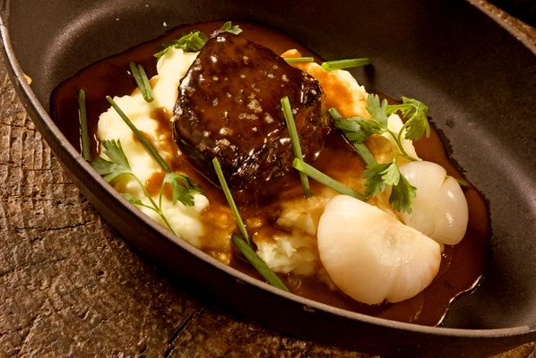 She ordered the excellent mini pot roast and I had the Dungeness crab carbonara. I love the pot roast: the meat is marinated in red wine for hours and is fork-shreddingly tender. It comes in a cast-iron serving dish smothered in a rich au jus and perched atop a huge mound of mashed potatoes, accompanied by French carrots and onion. It is hands-down one of the most delicious dishes I’ve had at any restaurant, period.