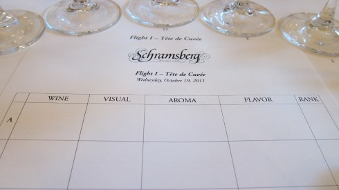 For the first flight, which was the blind tasting of the Schramsberg sparkling wines and the Champagnes, the idea was that we were supposed to rank the wines from first to seventh and determine if we could which were blanc de blancs and which contained Pinot Noir, and which were the Californian wines. These are my transcribed notes from A to G: