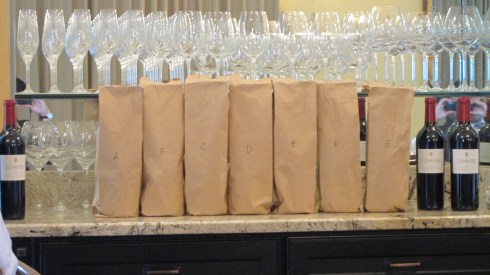 We were then led to long tables, where I sat next to David (the proprietor of the excellent Pearson’s Wine & Spirits in Glover Park) and the wine director of the Ritz-Carlton. The phalanx of glasses reproduced above awaited us, as well as scoring sheets: