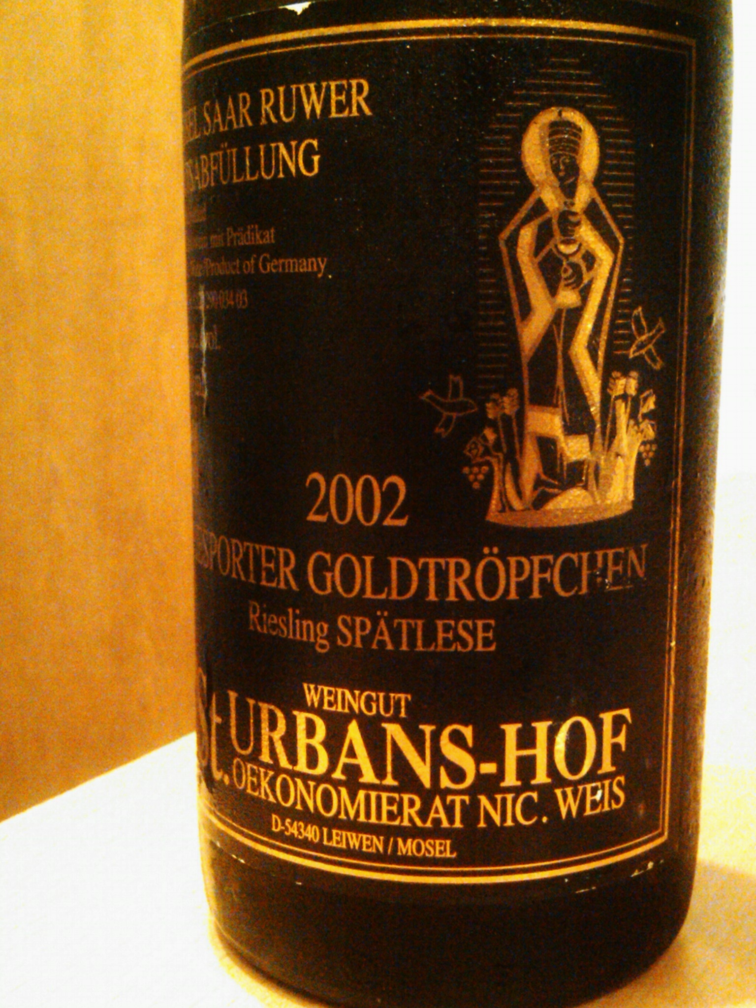No trip to any city would be complete without a tour of the local wine store scene, so upon the recommendations of my kind hosts I checked out the Wine Emporium on Columbus Street.  It had good selection and a large liquor/whiskey selection; the bottles skewed toward the less expensive, with the result that many of the usual “big names” or cult wines were lacking on the shelves.  No matter, because there were plenty of wines to occupy my time.  I picked up a premier cru Burgundy (a Mercurey, forgettable and forgotten, I’m afraid) and was browsing through the Germany shelf when I chanced upon this gem, the 2002 St. Urbans-Hof Piesporter Goldtröpfchen Riesling Spätlese: